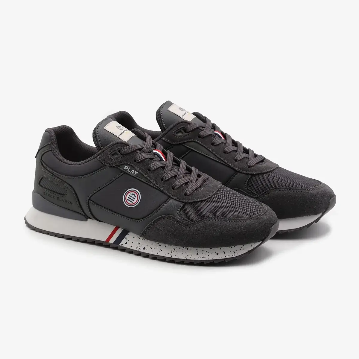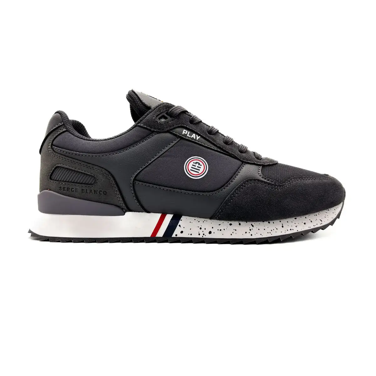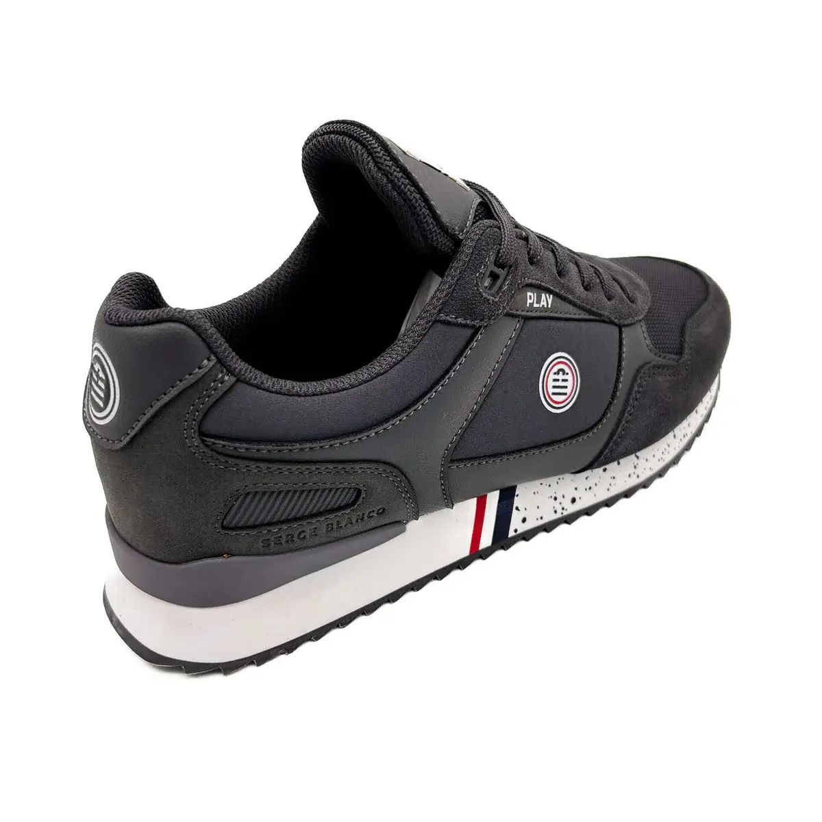 – Étiquette tissée SERGE BLANCO PLAY sur la languette et détail tricolore pour le passage des lacets