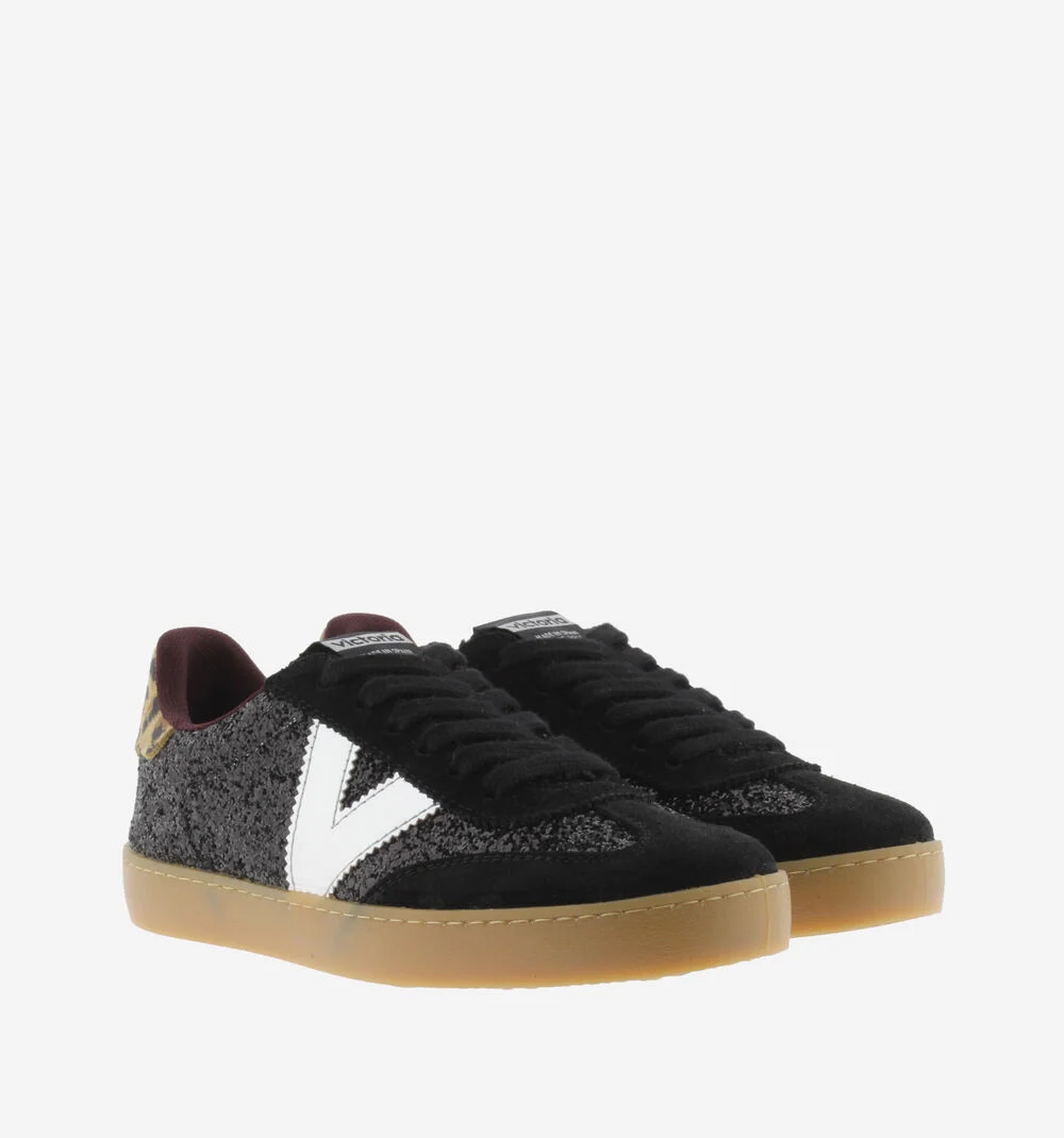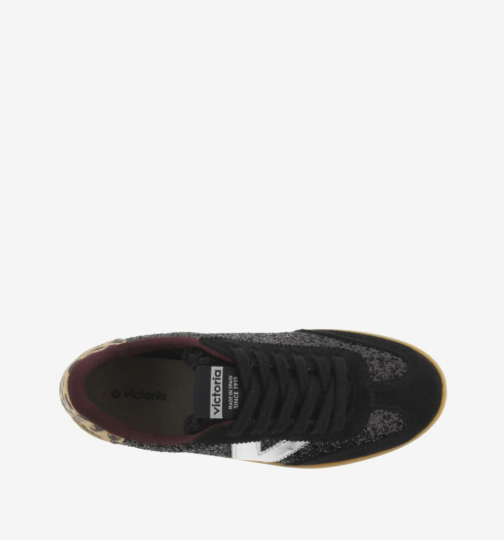 Baskets pour femme fabriquées en Espagne en glitter texturé et pièces en croûte de cuir. V latérale métallisée et détail animal print sur la pièce arrière (en noir). En couleur argent, les deux pièces sont en croûte de cuir craquelée. Fermeture par lacets épais assortis (en noir) et en animal print (en argent) avec nouvelle coupe cycliste à la pointe. Détail également en fausse fourrure sur la languette dans cette dernière couleur. Sa semelle translucide couleur caramel apporte une touche de style rétro. De plus, elles incluent une semelle intérieure plus ergonomique, confectionnée à partir de matériaux recyclés, offrant un confort supérieur à chaque pas.